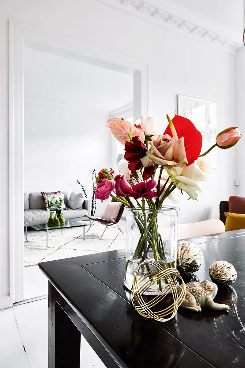 Là, assise dans ce décor si lumineux, spacieux, minimaliste, fleuri ... sauf que finalement je deviendrais dingue à aspirer sans cesse nos cheveux sur ce sol immaculé, que je me gèlerais avec une telle hauteur sous plafond, que j'aurais l'impression d'entendre de l'écho ... il me reste les fleurs sur lesquelles je ne vois aucun inconvénient.