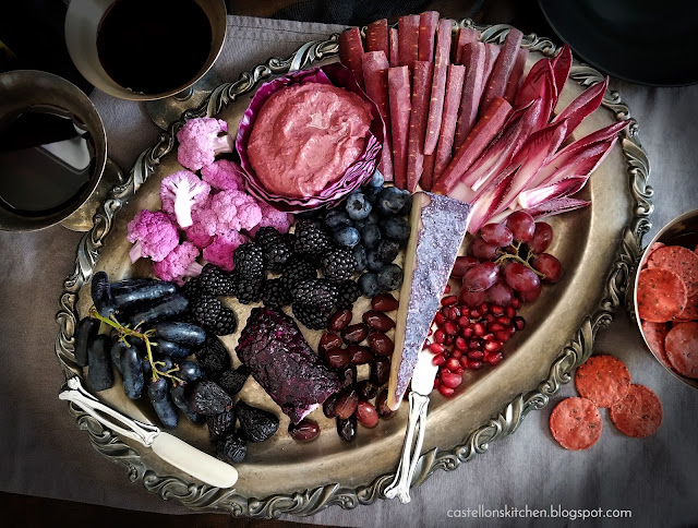 Pour une planche violette : chou violet, chou-fleur violet, chips de vitelotte, betterave, radis, figues ...