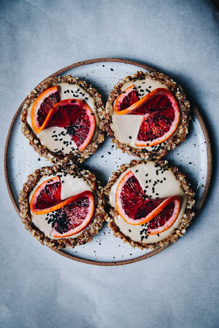 Toujours en portion individuelle, plus facile à conserver au frigo (partie de tétris !) et à servir à l'assiette, des tartelettes vegan au citron, noix de coco et orange sanguine. Un jeu de découpe de la tranche d'orange, et la tartelette prend des airs de starlette !